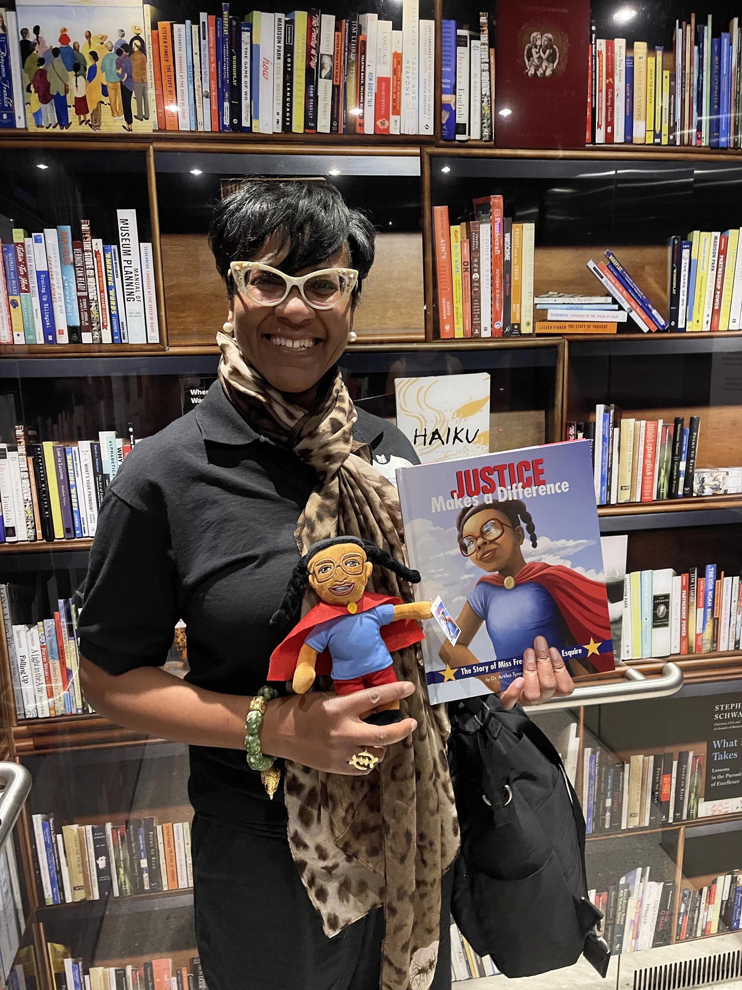 Justice Makes a Difference, an award-winning book, told the inspiring story of a young girl named Justice who learned, through the example of her grandmother and historical sheroes like Ella Baker and Ida B. Wells, that she was never too young to change the world. She dreamed of becoming “Miss Freedom Fighter, Esquire,” a superhero with a law degree and an afro, showing readers that leadership begins with learning and love for community.